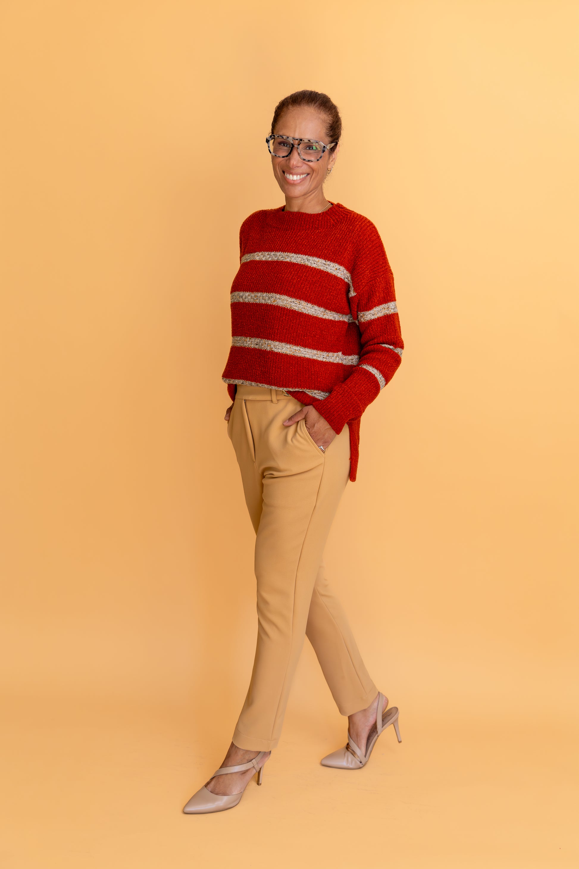 The Autumn Radiance Knit Sweater is designed to bring color, confidence, and comfort into your wardrobe. Featuring a rich warm red hue with soft neutral stripe detailing, this sweater instantly elevates your look while maintaining a refined, classic aesthetic.