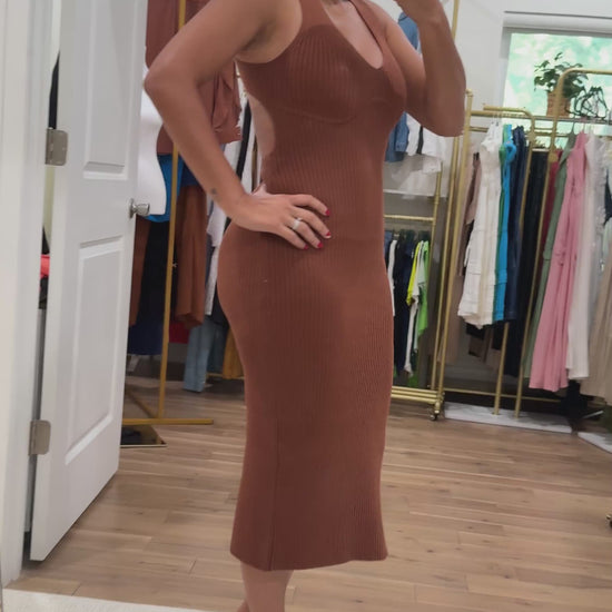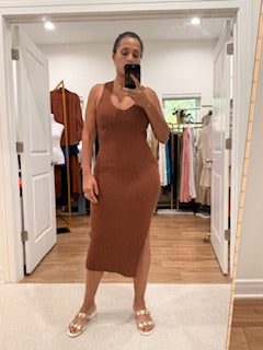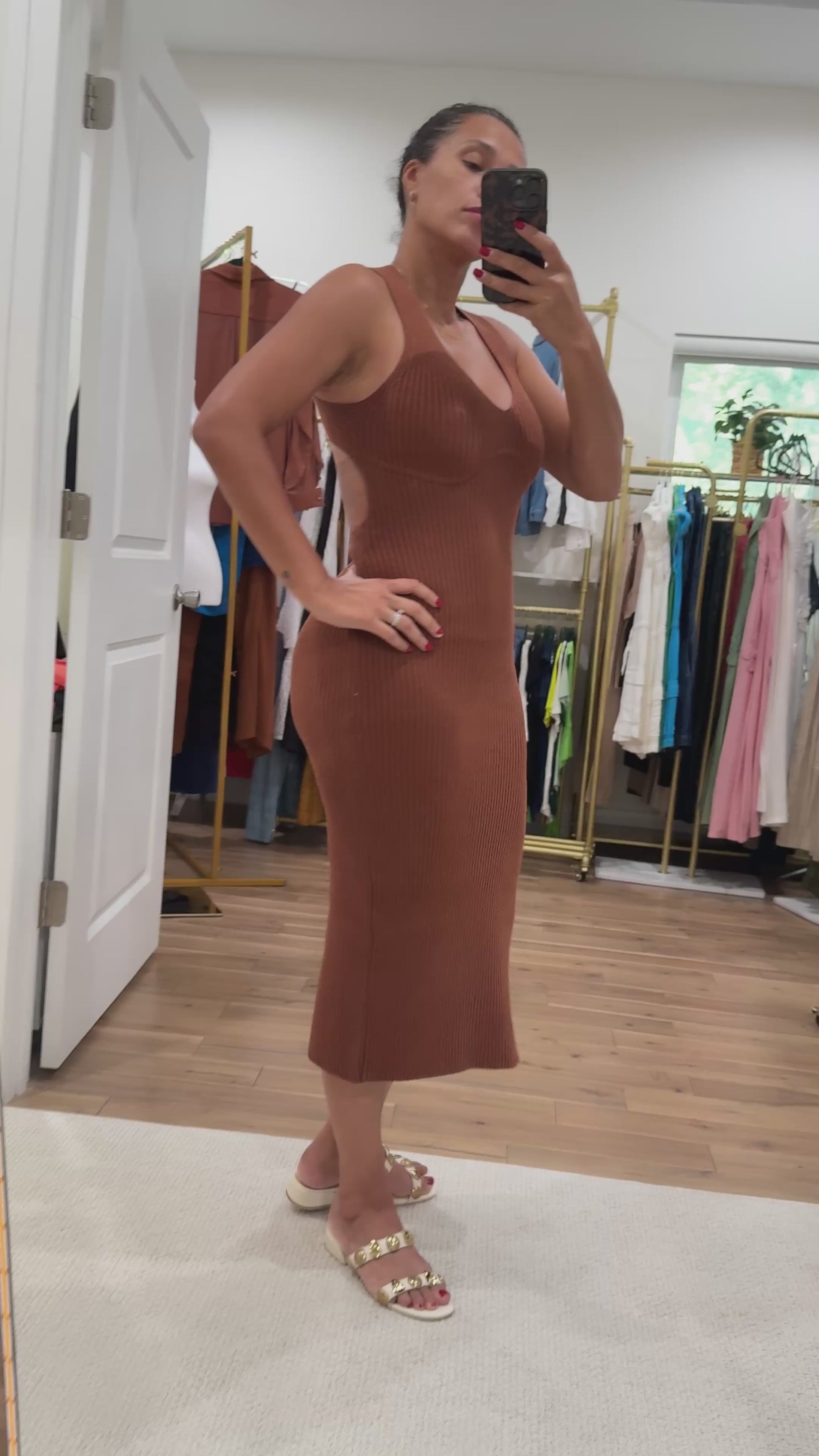 A true wardrobe essential, the Ribbed Knit Midi Dress offers timeless elegance with a modern touch. Crafted from a premium viscose-blend knit, it features a soft, stretchy texture that embraces your figure while ensuring all-day comfort. The deep neckline and subtle side slit add a refined allure, making it a versatile piece for any occasion.