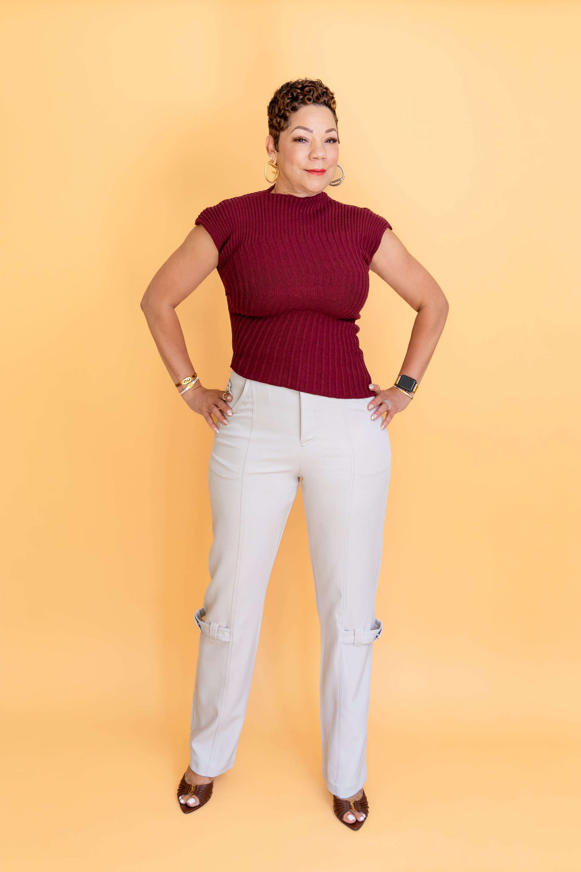 Designed in a structured, high-compression fabric that maintains comfort, these beige pants feature golden button accents at the waist and tailored seam details. Finished with functional ankle snaps for a sleek, contemporary twist.